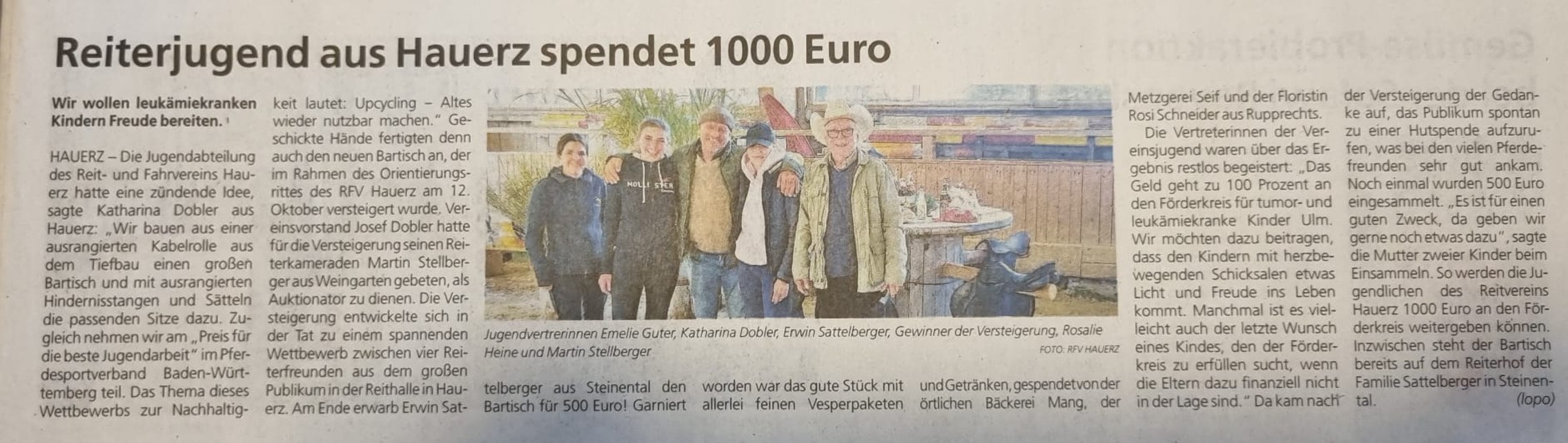 Reiterjugend aus Hauerz spendet 1000 € für guten Zweck 🐴