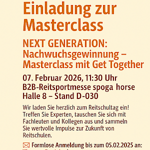 Unter dem Motto „NEXT GENERATION: Nachwuchsgewinnung – Masterclass mit Get Together“ stehen innovative Ideen, Austausch und wertvolles Fachwissen im Mittelpunkt. Erfahren Sie mehr über das große Zukunftsprojekt 100 Schulpferde plus, sprechen Sie direkt mit Expertinnen und Experten und nutzen Sie die Gelegenheit, sich mit Kolleginnen und Kollegen aus der Branche zu vernetzen.