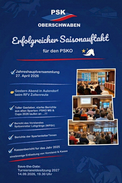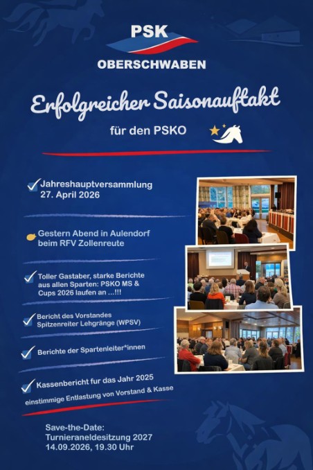 Der PSK Oberschwaben bedankt sich herzlich beim RFV Zollenreute für die hervorragende Ausrichtung der Versammlung, bei Eddy Stöferle für die wertvolle Unterstützung aus Verbandssicht sowie bei allen Teilnehmenden für ihr Engagement, ihre Beiträge und den gemeinsamen Blick nach vorne. Tollte Saison und Vorfreue in Sachen PSKO-Ball beim RFV Wolfegg!