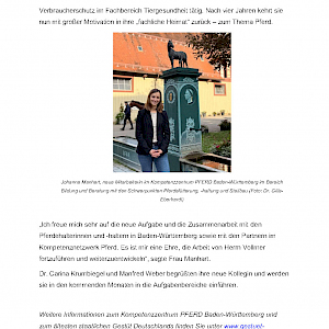 „Ich freue mich sehr auf die neue Aufgabe und darauf, die Arbeit von Herrn Vollmer weiterzuführen und weiterzuentwickeln“, sagt Manhart. Im Kompetenzzentrum wird sie künftig die Themen Pferdefütterung, -haltung und Stallbau verantworten – und damit zentrale Bereiche für Tierwohl und moderne Pferdehaltung.