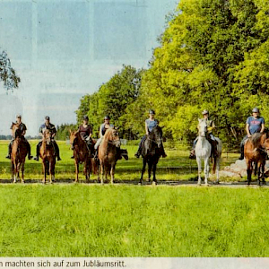 Zwölf Reiterinnen und Reiter aus den Wanderreitstationen sattelten ihre Pferde und ritten unter der Leitung von Gunnar Schillig bei traumhaftem Wetter eine 20 Kilometer lange Strecke rund um die Kirche von Steinhausen und durch die idyllischen Wälder der Region.