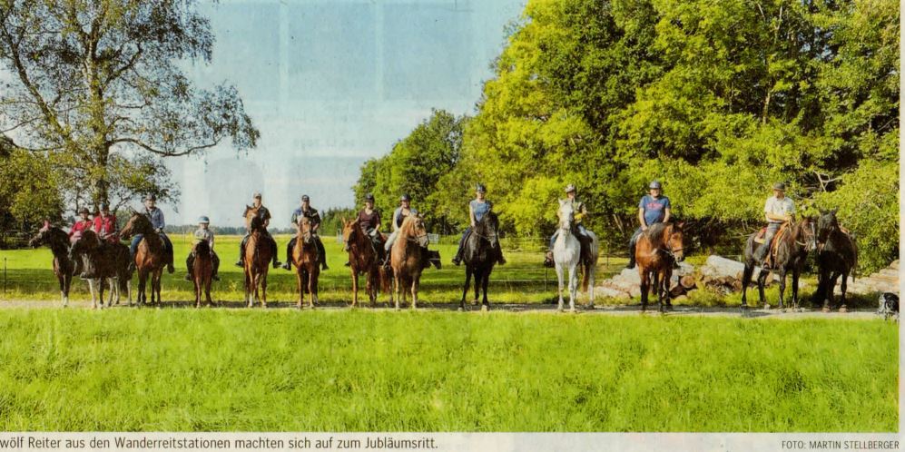 Zwölf Reiterinnen und Reiter aus den Wanderreitstationen sattelten ihre Pferde und ritten unter der Leitung von Gunnar Schillig bei traumhaftem Wetter eine 20 Kilometer lange Strecke rund um die Kirche von Steinhausen und durch die idyllischen Wälder der Region.
