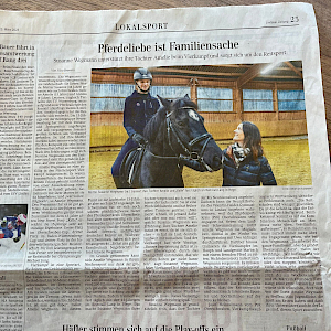 Im Artikel „Pferdeliebe ist Familiensache“ (SZ, Lokalteil, Seite 23) wird deutlich, wie sehr sich Mutter Susanne Wigmann für ihre Tochter und den Reitsport engagiert. Ob beim Training, bei der Organisation oder als mentale Stütze – Susanne ist immer dabei. Das Foto zeigt die beiden gemeinsam mit ihrem Pferd in der Reithalle: eine Szene, die für viele junge Sportlerinnen und Sportler sinnbildlich ist.