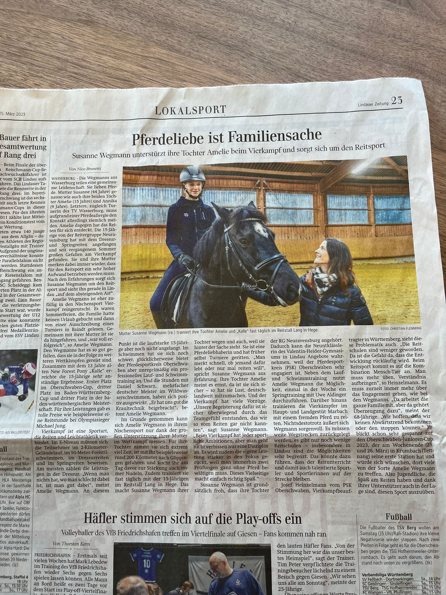 Im Artikel „Pferdeliebe ist Familiensache“ (SZ, Lokalteil, Seite 23) wird deutlich, wie sehr sich Mutter Susanne Wigmann für ihre Tochter und den Reitsport engagiert. Ob beim Training, bei der Organisation oder als mentale Stütze – Susanne ist immer dabei. Das Foto zeigt die beiden gemeinsam mit ihrem Pferd in der Reithalle: eine Szene, die für viele junge Sportlerinnen und Sportler sinnbildlich ist.
