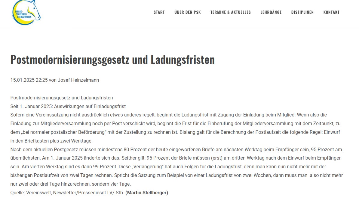 Nach dem aktuellen Postgesetz müssen mindestens 80 Prozent der heute eingeworfenen Briefe am nächsten Werktag beim Empfänger sein, 95 Prozent am übernächsten. Am 1. Januar 2025 änderte sich das. Seither gilt: 95 Prozent der Briefe müssen (erst) am dritten Werktag nach dem Einwurf beim Empfänger sein. Am vierten Werktag sind es dann 99 Prozent. Diese „Verlängerung“ hat auch Folgen für die Ladungsfrist, denn man kann nun nicht mehr mit der bisherigen Postlaufzeit von zwei Tagen rechnen. Spricht die Satzung zum Beispiel von einer Ladungsfrist von zwei Wochen, dann muss man also nicht mehr nur zwei oder drei Tage hinzurechnen, sondern vier Tage.