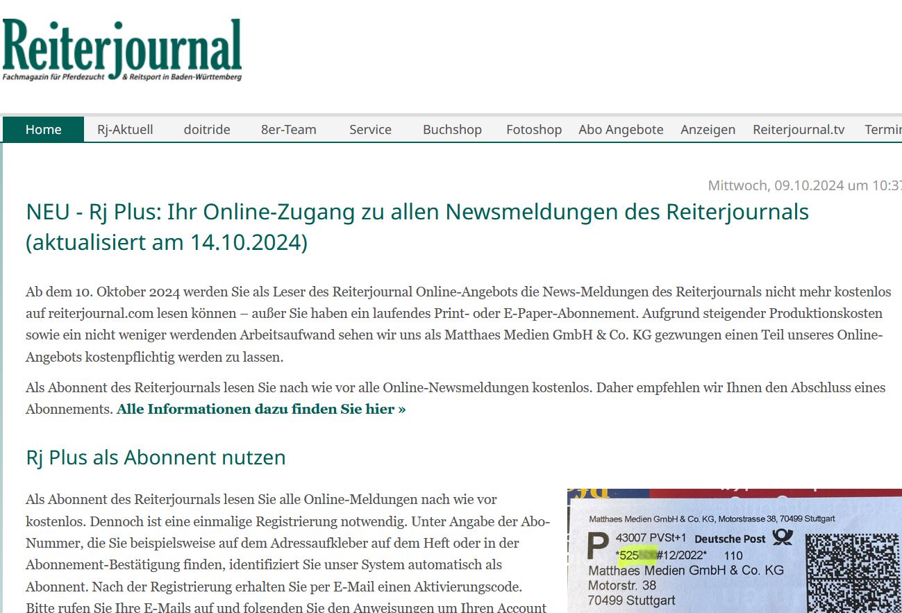 Seit einigen Wochen sind die Onlinemeldungen auf der Webseite des Reiterjournals im Rahmen von RJ-Plus nicht mehr kostenfrei verfügbar.