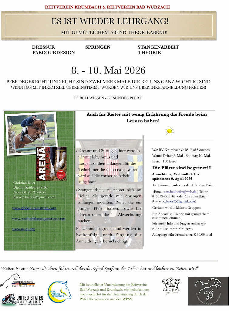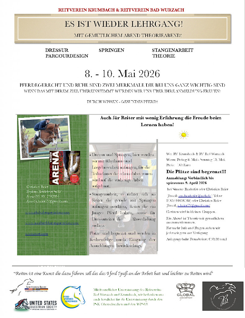 ✨ Einladung zum Reitlehrgang 8.–10. Mai 2026 mit Christian Baier beim RFV Krumbach & RFV Bad Wurzach!✨ Einladung zum Reitlehrgang 8.–10. Mai 2026 ✨Liebe Reiterinnen und Reiter, 📍 Veranstaltungsorte (fürs Navi)Reit- und Fahrverein KrumbachAdresse: Krumbach 48, 88069 Krumbach (Tettnang) Reit- und Fahrverein Bad WurzachAdresse: Ravensburger Straße 75, 88410 Bad Wurzach 📅 TerminFreitag, 8. Mai – Sonntag, 10. Mai 2026 💰 Kosten
