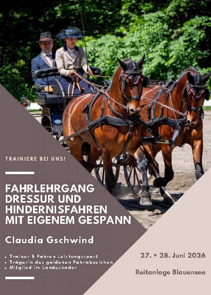 🌟 PSKO-Fahrlehrgang-Serie 2026 mit Claudia Gschwind auf der Reitanlage Blauensee (September)🎉 Einladung zum Fahrlehrgang mit Claudia Gschwind!Dressur & Hindernisfahren mit eigenem Gespann12. & 13. September 2026 – Reitanlage BlauenseeSchnapp dein Gespann – es wird sportlich! 🗓 AblaufSamstag, 12. September 2026