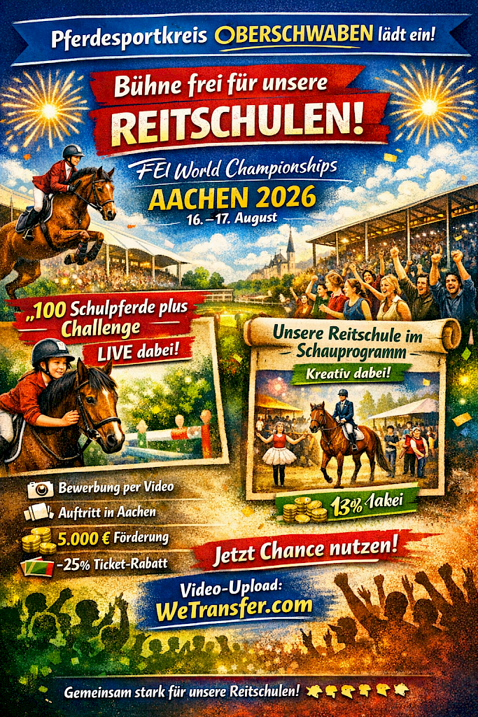 FEI World Championships Aachen 2026 - Highlight 2: Schauwettbewerb „Unsere Reitschule bei den FEI WCH 2026“ 🐎✨🐎✨ Einladung: Reitsportvereine on Tour – zu den FEI World Championships Aachen 2026! ✨🐎Liebe Reitschüler:innen, liebe Eltern, liebe Vereinsmitglieder, Aachen ruft – und wir haben die Chance, dabei zu sein! Als Partnerverein des Projekts „100 Schulpferde plus“ sind wir herzlich eingeladen, unsere Reitschul‑ und Nachwuchsarbeit auf internationaler Bühne zu präsentieren – und möchten diese einmalige Gelegenheit gern gemeinsam mit Euch nutzen! 🌟 Highlight 1: „100 Schulpferde plus Challenge“📅 Sonntag, 16. August 2026 Der Finaltag der Vielseitigkeit & des Voltigierens wird erstmals zum „Tag der Reitschulen“! 👉 So könnt Ihr teilnehmen: