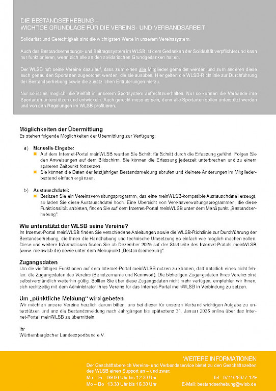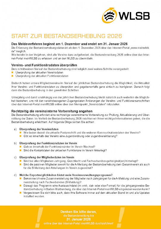 Bitte denkt daran: Alle Vereine müssen ihre Bestandsmeldung bis spätestens 31. Januar 2026 online über das Portal https://www.meinwlsb.de einreichen.