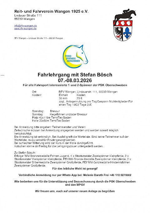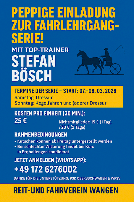 Am 21. und 22. Februar 2026 findet beim RFV Wolfegg der Jugendförderung Springlehrgang mit Steffen Heinzelmann statt!