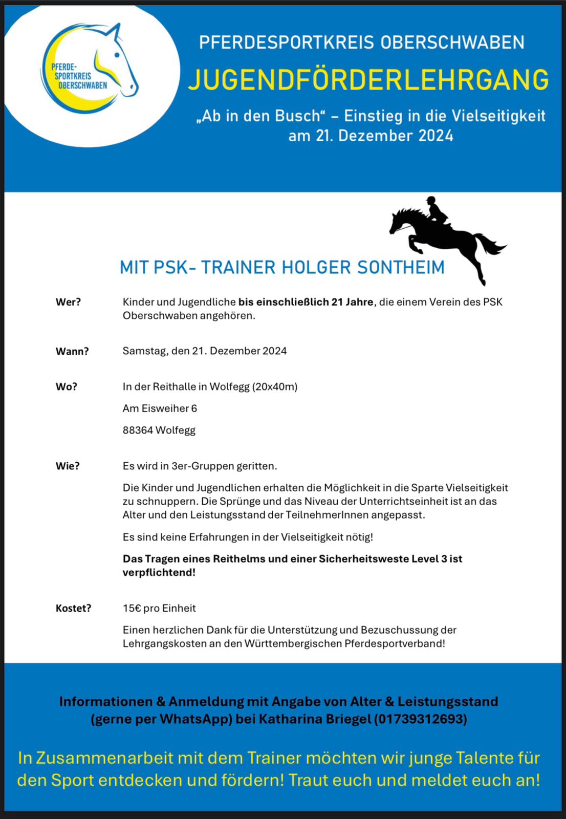 Wolfegg, 1.–2. Februar 2025 – Mit Vollgas ins neue Jahr: Der erste PSKO-Jugendförderlehrgang Vielseitigkeit unter dem Motto „Ab in den Busch – Einstieg in die Vielseitigkeit“ war ein voller Erfolg! Ganze 24 Teilnehmerinnen und Teilnehmer im Alter von 9 bis 21 Jahren folgten der Einladung auf die Reitanlage in Wolfegg – und erlebten zwei intensive, lehrreiche und motivierende Tage.
