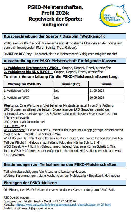 Die PSK-Meister Voltigieren 2024 werden beim Turnier in Isny-Rohrdorf ermittelt. Die Ergebnisse und Regelwerke zur Meisterschaft sind auf der offiziellen Seite des Württembergischen Pferdesportverbandes (WPSV) unter dem Bereich PSK Oberschwaben abrufbar:
