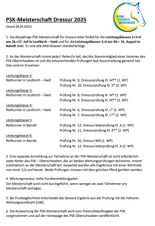 Leutkirch-Haid, 26.â27. Juli 2025 â Die ersten PSK-Meister 2025 in der Dressur stehen fest! Auf der Reitanlage des PSV Leutkirch-Haid wurde am letzten Juli-Wochenende in den Leistungsklassen 2, 3 und 4 um die begehrten Titel geritten â und das bei echten âOberschwaben-Wetterbedingungenâ: Regen, Wind und matschige Böden konnten die Reiterinnen und Reiter nicht stoppen!