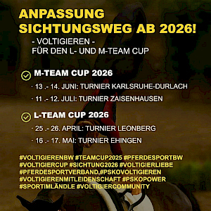Der Disziplinausschuss Voltigieren des Pferdesportverbandes Baden-Württemberg hat die Weichen für die kommende Saison gestellt: Ab 2026 gibt es ein neues Sichtungsverfahren für den L- und M-Team Cup!