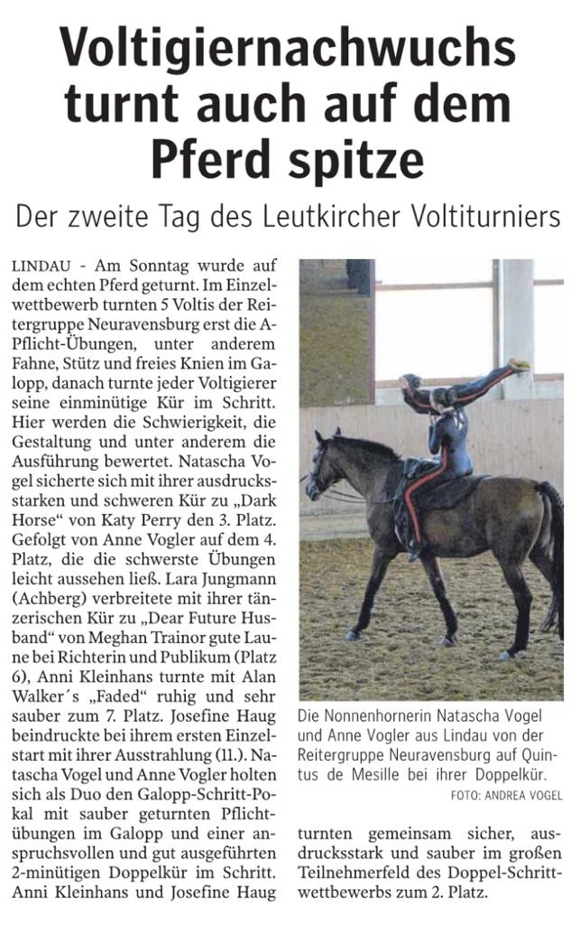 Am zweiten Tag des Leutkircher Voltiturniers zeigten die Nachwuchsvoltigiererinnen der Reitergruppe Neuravensburg beeindruckende Leistungen im Einzelwettbewerb. Auf dem Pferd Quintus de Mesille, longiert von Roswitha Ehrle, turnten die jungen Athletinnen Pflichtübungen wie Fahne, Stütz und freies Knien im Galopp, gefolgt von einer einminütigen Kür im Schritt.