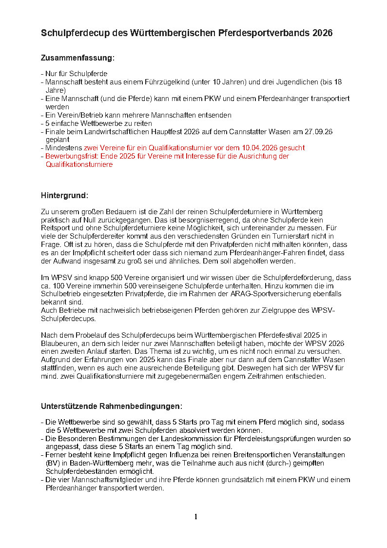 wir freuen uns, euch zum Schulpferde-Cup 2026 einzuladen – ein Wettbewerb, der ganz den Schulpferden gewidmet ist! Nach dem erfolgreichen Probelauf 2025 starten wir nun in die nächste Runde und möchten gemeinsam mit euch ein starkes Zeichen für den Schulpferdesport setzen.