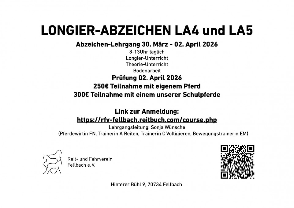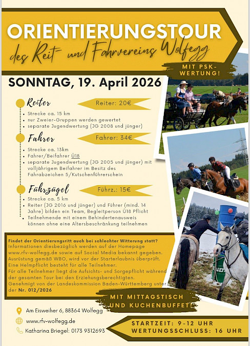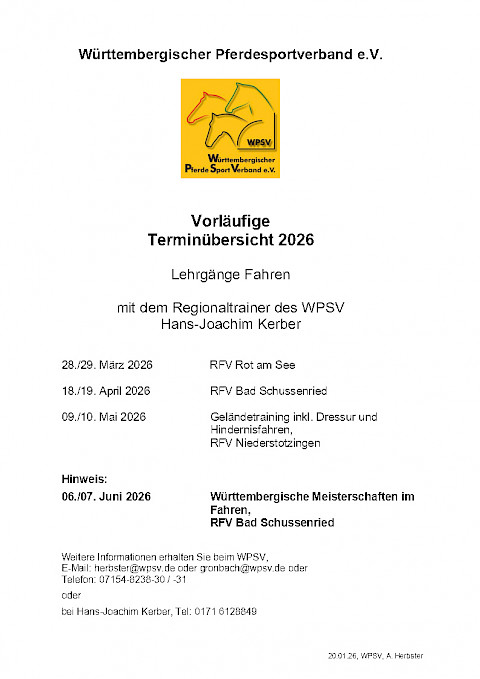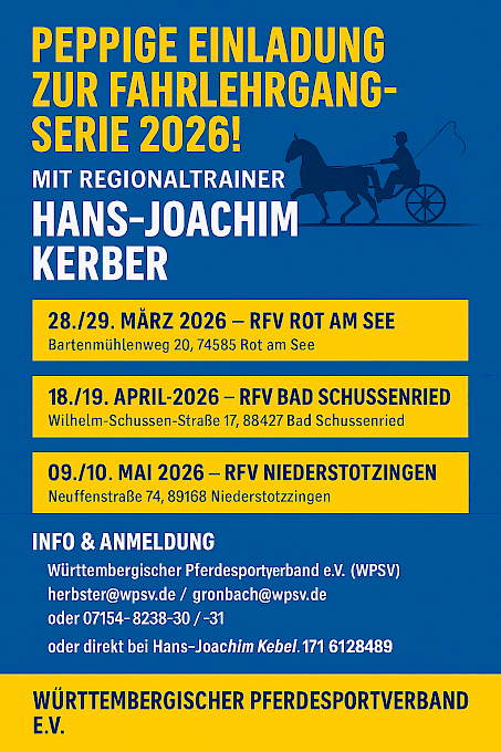 🌟 WPSV-Fahrlehrgang-Serie 2026 mit Hans-Joachim Kerber in Rot am See🚀 EINLADUNG ZUR FAHRLEHRGANG‑SERIE 2026!... mit Regionaltrainer Hans‑Joachim Kerber (WPSV)Lust, dieses Jahr so richtig Fahrt aufzunehmen? 📅 Termine 2026 – Sei dabei!📍 28./29. März 2026 – RFV Rot am SeePerfekter Saisonstart: Technik, Dressur, Training für’s sichere Anfahren. 📍 18./19. April 2026 – RFV Bad SchussenriedDer Klassiker im Frühjahr: Verfeinere Zügelhilfen, Linienführung & Präzision. 📍 09./10. Mai 2026 – RFV NiederstotzingenGeländetraining inkl. Dressur & Hindernisfahren – für alle, die Tempo UND Technik lieben! 🏆 Highlight‑Hinweis06./07. Juni 2026 – Württembergische Meisterschaften Fahren, RFV Bad Schussenried 📩 Infos & AnmeldungWürttembergischer Pferdesportverband e.V. (WPSV) 🎉 Warum du dabei sein solltest