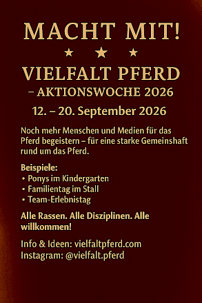 Infos & Ideen: Einladung zum MitmachenMach mit bei der Aktionswoche „Vielfalt Pferd“ vom 12. bis 20. September 2026! 👉 Alle Rassen. Alle Disziplinen. Alle willkommen!