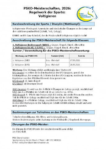 📣 🐴 PSKO-Meisterschaften Voltigieren 2026 in Isny! 🏆🎠 Einladung zur PSKO Meisterschaft – Voltigieren 🎠 Liebe Pferdesportfreunde, 📍 Ort: RFV Isny-Rohrdorf, Lochter 2, 88316 Isny Was erwartet euch? Kommt vorbei und erlebt einen Tag voller Action, Pferdestärken und Geselligkeit! Wir freuen uns auf euch!