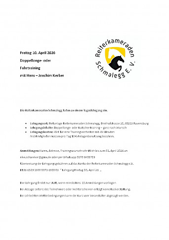 Kurz: Fachlich top – menschlich motivierend – pferdegerecht in jeder Trainingseinheit. ⚠️ Wichtige Hinweise & Teilnahmebedingungen Für den Lehrgang gelten folgende Regelungen: