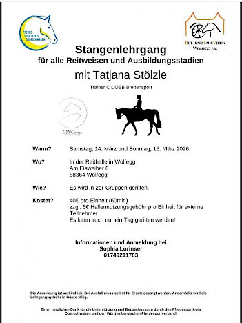 🌟 PSKO-Stangenlehrgang mit Tatjana Stölzle in Wolfegg🌟 Einladung zum Stangenlehrgang für alle Reitweisen und Ausbildungsstadien mit Tatjana Stölzle in WolfeggTrainer C DOSB Breitensport 📍 Wo? 🐴 Wie? 💰 Kosten: 📞 Infos & Anmeldung: