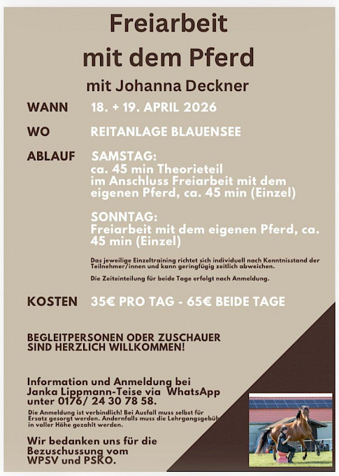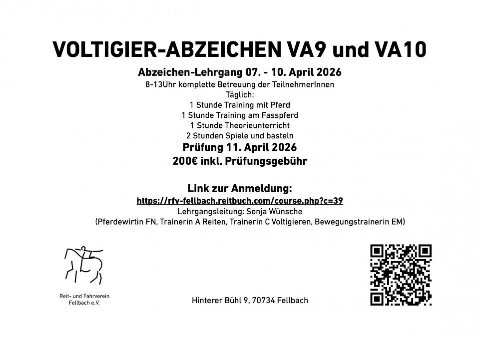 👩🏫 ReferentinSilke Förster 💶 Kosten35 € pro Teilnehmer, inkl. ⏳ Meldeschluss01. März 2026 🧾 Für die Lizenzverlängerung7 LE (Profil 3) für die Verlängerung der DOSB‑Lizenz Voltigieren 📬 AnmeldungMonika Schmidt ⭐ Wir freuen uns auf einen lehrreichen, motivierenden und inspirierenden Fortbildungstag mit euch!