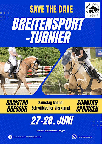 🎉Breitensport‑Turnier 2026: Dressur & Springen mit Schwäbischem Vierkampf!🎉 Einladung zum Breitensport‑Turnier 2026! 🎉27. – 28. Juni | Reitclub BergatreuteDer RC Bergatreute lädt herzlich ein zu einem sportlichen, spannenden und vielseitigen Turnierwochenende – ein Event für Reiter*innen, Pferdefreunde und Zuschauer! 🐴 Was erwartet euch?⭐ Samstag – DressurElegante Ritte, konzentrierte Teams und wunderschöne Momente im Dressurviereck. ⭐ Samstag Abend – Schwäbischer VierkampfSportlich, abwechslungsreich, spannend – Zuschauer willkommen! ⭐ Sonntag – SpringenTempo, Technik und Nervenkitzel im Parcours – Action garantiert! 📅 Termin:27. – 28. Juni 📍 Ort:Reitclub Bergatreute 💬 Warum ihr dabei sein solltet: