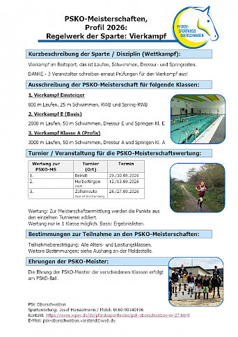 📣 🐴 PSKO-Meisterschaften Vierkampf (Cup) 2026 in Herbertingen (Station 2)! 🏆🏆🔥 Einladung zu den PSKO‑Meisterschaften 2026 – Vierkampf als Cup! 🔥🏆Laufen • Schwimmen • Dressur • Springen – EIN Wettkampf, vier Herausforderungen!Der Pferdesportkreis Oberschwaben lädt alle sportbegeisterten Reiterinnen, Vierkämpferinnen und Vereine herzlich zu den PSKO‑Meisterschaften 2026 in der Sparte Vierkampf ein – dieses Jahr wieder als Cup‑Wertung über drei Turniere! 🐎 Was ist Vierkampf?Vierkampf verbindet klassische Leichtathletik mit Reitsport – ein spannender Mix aus Ein Format, das Teamgeist, Fitness und reiterliches Können perfekt vereint! 🥇 Ausgeschrieben werden die PSKO‑Meistertitel in drei Klassen:⭐ 1. Vierkampf Einsteiger