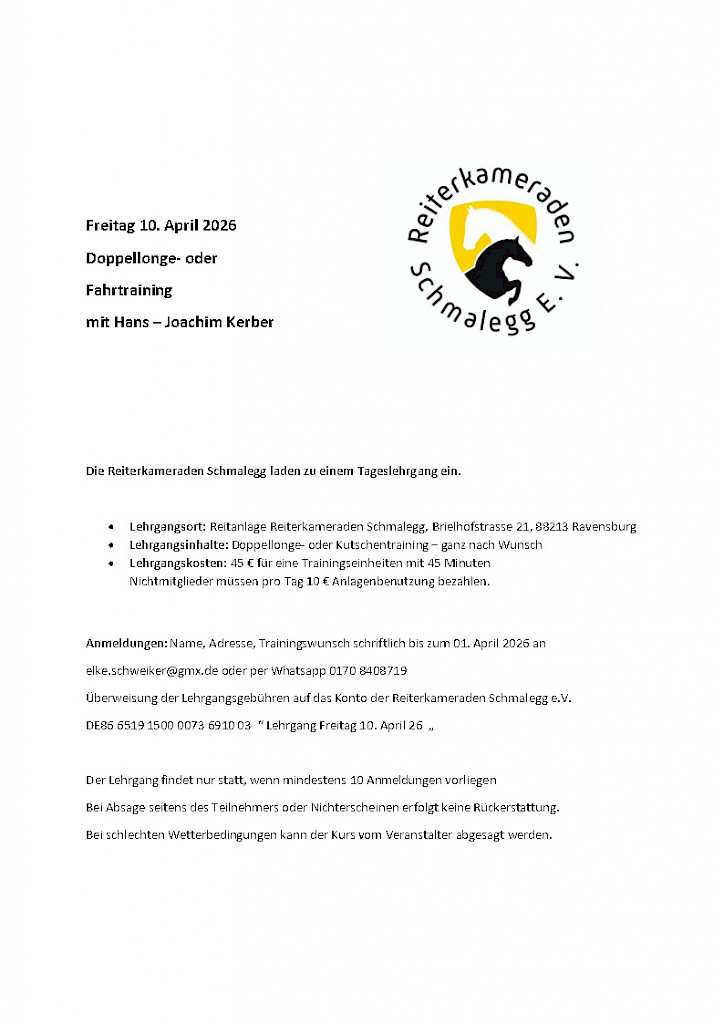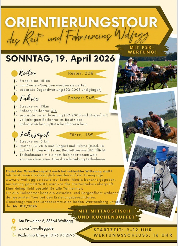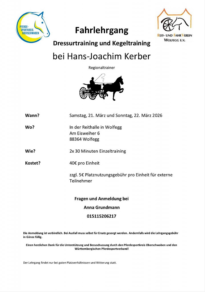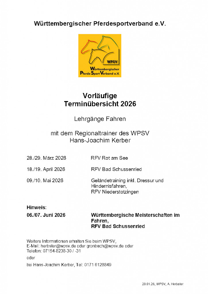 🌟 WPSV-Fahrlehrgang-Serie 2026 mit Hans-Joachim Kerber in Rot am See🚀 EINLADUNG ZUR FAHRLEHRGANG‑SERIE 2026!... mit Regionaltrainer Hans‑Joachim Kerber (WPSV)Lust, dieses Jahr so richtig Fahrt aufzunehmen? 📅 Termine 2026 – Sei dabei!📍 28./29. März 2026 – RFV Rot am SeePerfekter Saisonstart: Technik, Dressur, Training für’s sichere Anfahren. 📍 18./19. April 2026 – RFV Bad SchussenriedDer Klassiker im Frühjahr: Verfeinere Zügelhilfen, Linienführung & Präzision. 📍 09./10. Mai 2026 – RFV NiederstotzingenGeländetraining inkl. Dressur & Hindernisfahren – für alle, die Tempo UND Technik lieben! 🏆 Highlight‑Hinweis06./07. Juni 2026 – Württembergische Meisterschaften Fahren, RFV Bad Schussenried 📩 Infos & AnmeldungWürttembergischer Pferdesportverband e.V. (WPSV) 🎉 Warum du dabei sein solltest