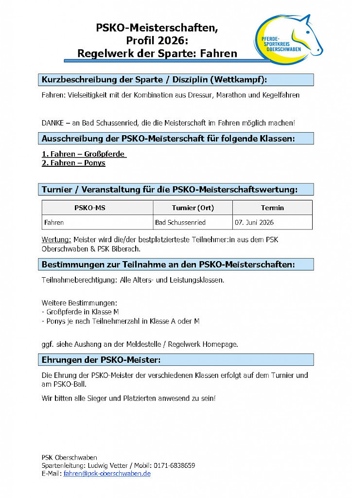 📣 🐴 PSKO-Meisterschaften Fahren 2026 in Bad Schussenried! 🏆🎠 Einladung zur PSKO Meisterschaft – Fahren 🎠 Liebe Pferdesportfreunde, 📍 Ort: RFV Bad Schussenried, Wilhelm-Schussen-Straße 17, 88427 Bad Schussenried Was erwartet euch? Kommt vorbei und erlebt einen Tag voller Action, Pferdestärken und Geselligkeit! Wir freuen uns auf euch!