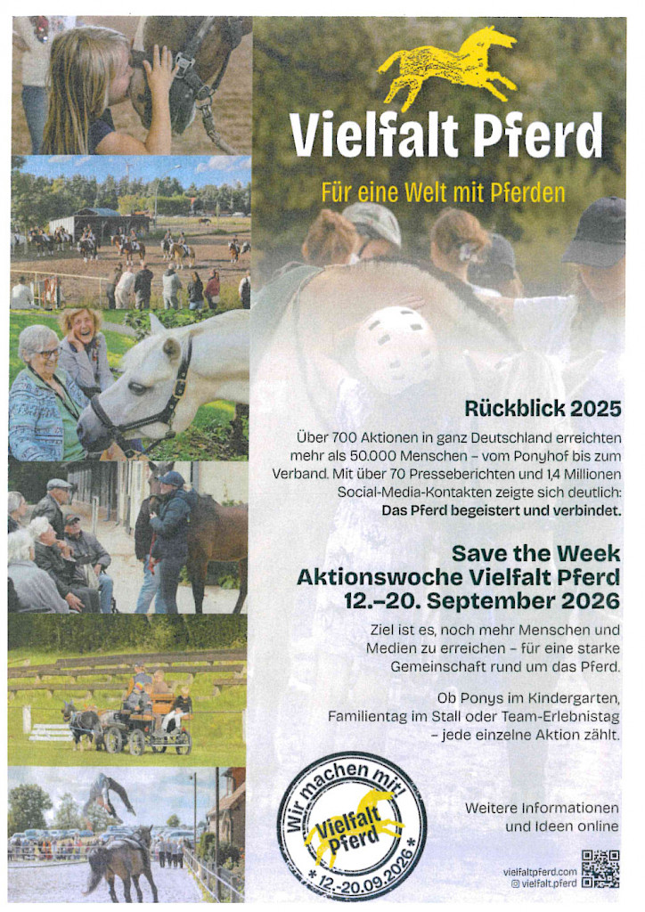 Infos & Ideen: Einladung zum MitmachenMach mit bei der Aktionswoche „Vielfalt Pferd“ vom 12. bis 20. September 2026! 👉 Alle Rassen. Alle Disziplinen. Alle willkommen!