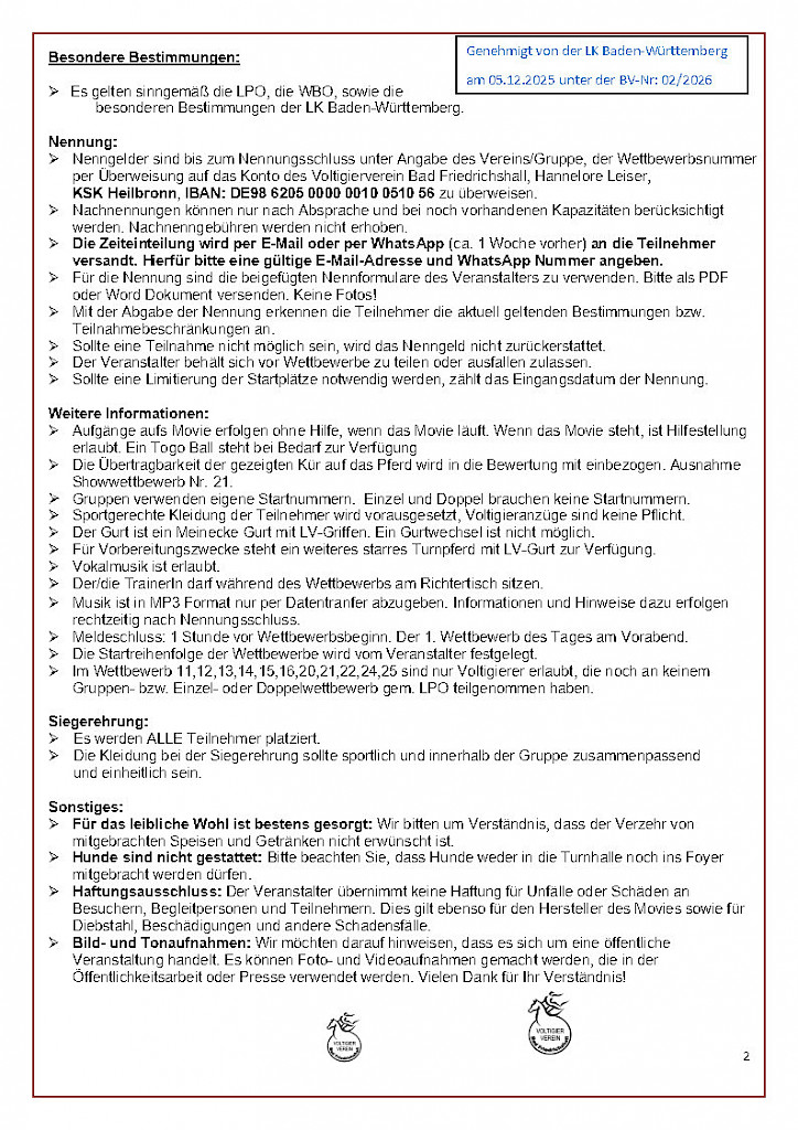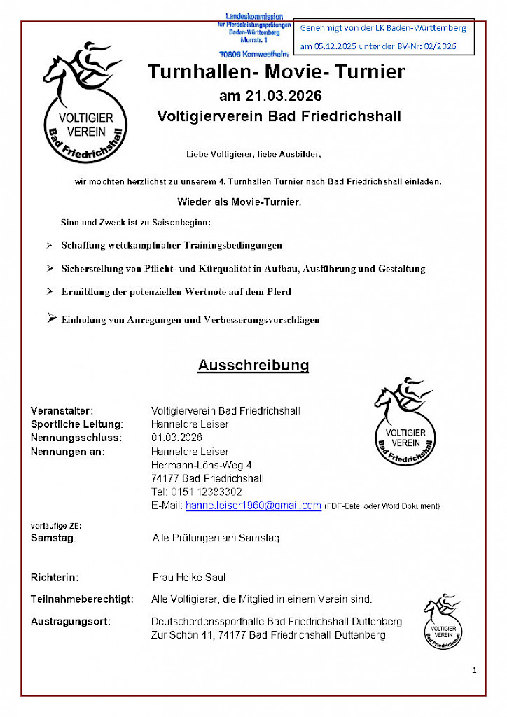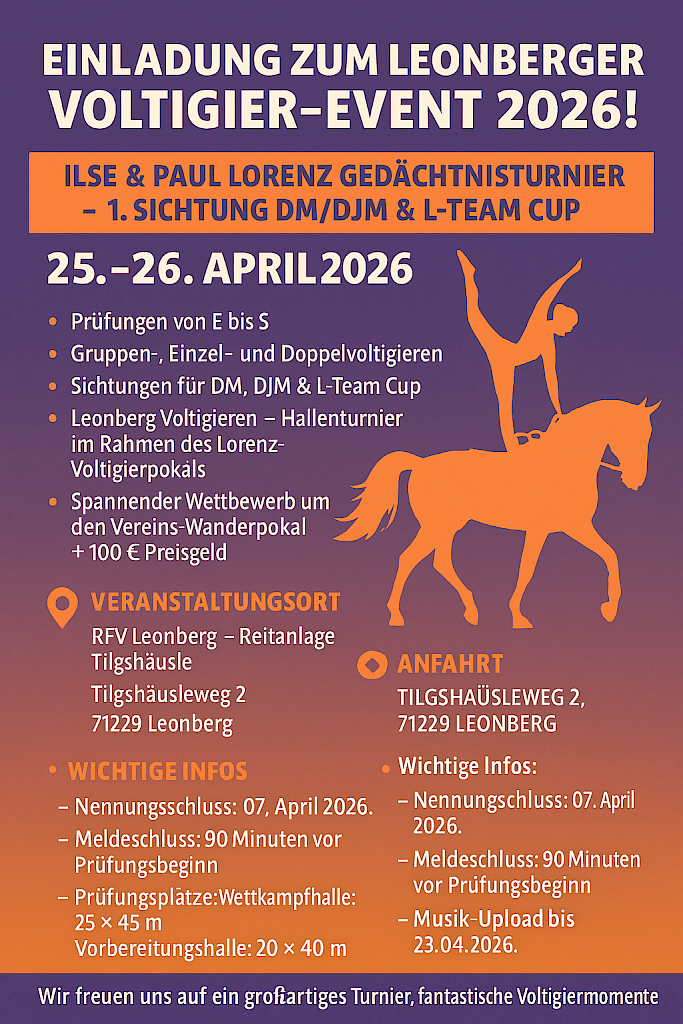 Turnier Voltigieren: Holzpferd-&Movie-Turnier bei den Pferdefreunden Luppmanns in Amtzell 🔥🎉🎉 Einladung zum 3. Holzpferde‑Turnier 2026Pferdefreunde Luppmanns e.V. Liebe Voltigiererinnen, Trainerinnen, Vereine und Pferdesportfreunde, wir freuen uns riesig, euch herzlich zu unserem Freut euch auf einen sportlichen, kreativen und fröhlichen Voltitag, an dem sowohl Einsteiger als auch Turniererfahrene auf ihre Kosten kommen. Egal ob Einzel, Doppel oder Gruppe – für jede Altersklasse ist etwas dabei! 🏆 Was euch erwartet✔ Einsteiger- und Turnierwettbewerbe in Einzel, Doppel und Gruppe Alle Details zu Anforderungen, Altersklassen und Zeitlimits findet ihr in der offiziellen Ausschreibung. 📅 Wichtige Termine