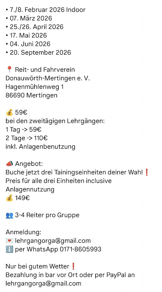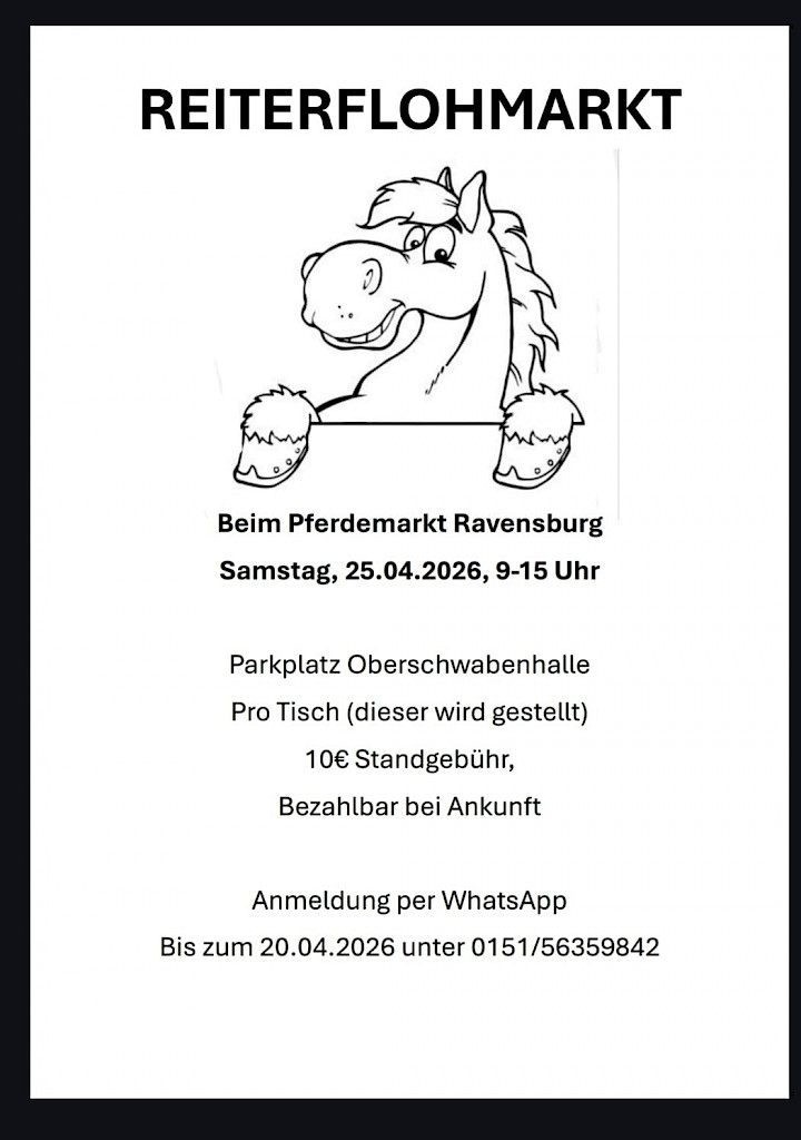 🌟 Vielseitigkeitslehrgang mit Nicole Grimm bei der Reitergruppe Neuravensburg!🐴🔥 Einladung zum Vielseitigkeitslehrgang mit Nicole Grimm21. & 22. März 2026Die Reitergruppe Neuravensburg e.V. lädt herzlich zu einem abwechslungsreichen, motivierenden und lehrreichen Vielseitigkeitslehrgang ein! Zwei Tage voller Technik, Training, Tempo & Geländespaß – passend für jede Trainingsstufe. 📍 Veranstaltungsort / Navi‑AdresseMooshof Reitfläche: 30 × 80 m Ebbe‑Flut‑Terratex 💶 Lehrgangskosten