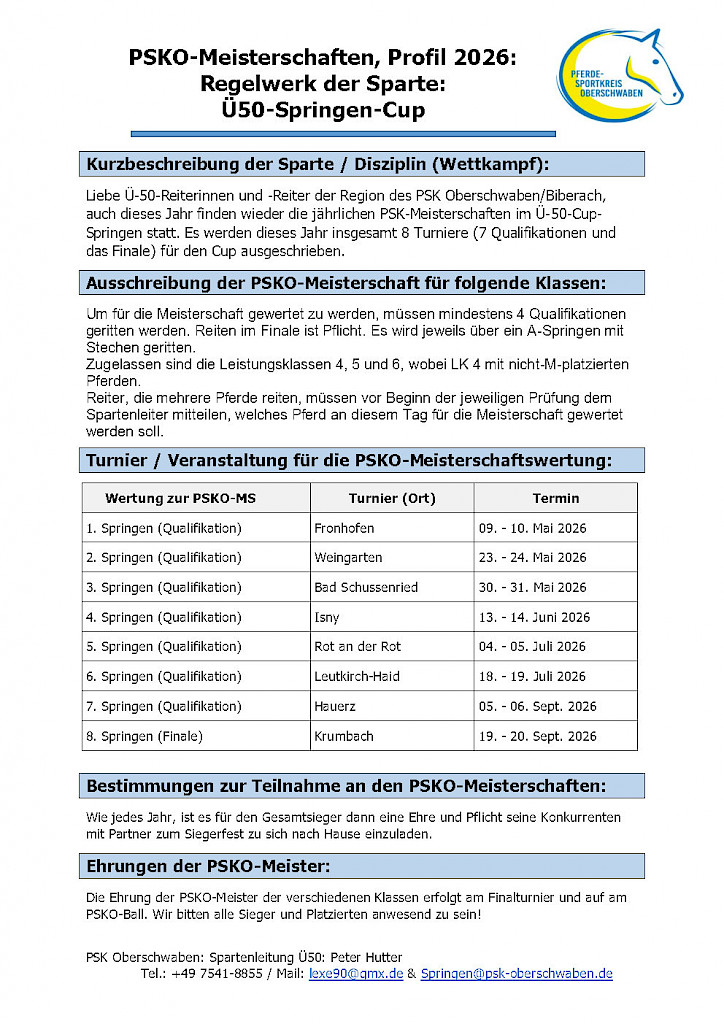 📣 🐴 PSKO-Meisterschaften Springen Ü50: Springen Ü50-Cup 2026 in Bad Schussenried! 🏆🐴 Station 3 für den Springen Ü50-Cup 2026 – Bad Schussenried lädt ein! ✨ 📣 Save the Date! Die Springsportserie Ü50 richtet sich an alle ausgewiesenen Alters- und Leistungsklassen – siehe Ausschreibung! Bitte Anmeldung bei Peter Hutter beachten. Punkte aus den einzelnen Veranstaltungen fließen in die PSK-Meisterschaftswertung, bei der am Ende des Jahres die besten Jumper geehrt werden. 🔗 Vier Teilnahmen sind Pflicht, alle Stationen mit Teilnahme zahlen aufs Gesamtergebnis ein; Teilnahme am Finale ist ebenfalls Pflicht – also ideale Chancen für alle, die mitmachen wollen! 📌Warum dabei sein?