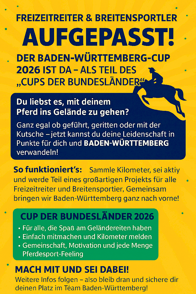 📌 Freizeitreiter & Breitensportler aufgepasst: Baden-Württemberg dabei beim "Cups der Bundesländer"🏇🐴 Freizeitreiter & Breitensportler aufgepasst!Der Baden-Württemberg-Cup 2026 ist da – als Teil des „Cups der Bundesländer“! Du liebst es, mit deinem Pferd ins Gelände zu gehen? So funktioniert’s: 📅 Cup der Bundesländer 2026 👉 Mach mit und sei dabei! Bild mit freundlicher Genehmigung: Baden-Württemberg ist 2026 erstmals beim Cup der Bundesländer dabei. / © Adobe Stock