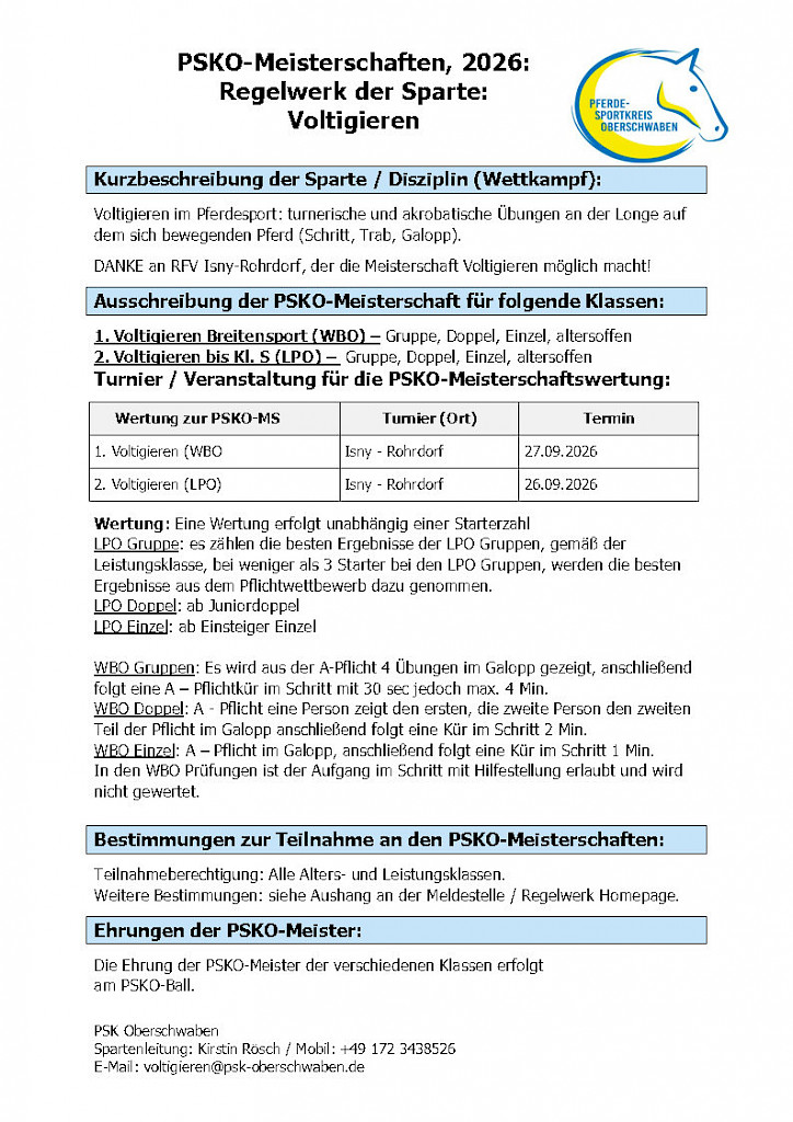 📣 🐴 PSKO-Meisterschaften Voltigieren 2026 in Isny! 🏆🎠 Einladung zur PSKO Meisterschaft – Voltigieren 🎠 Liebe Pferdesportfreunde, 📍 Ort: RFV Isny-Rohrdorf, Lochter 2, 88316 Isny Was erwartet euch? Kommt vorbei und erlebt einen Tag voller Action, Pferdestärken und Geselligkeit! Wir freuen uns auf euch!