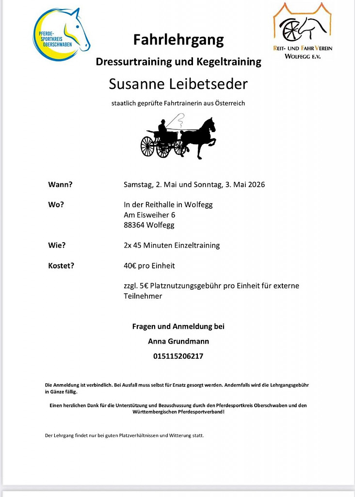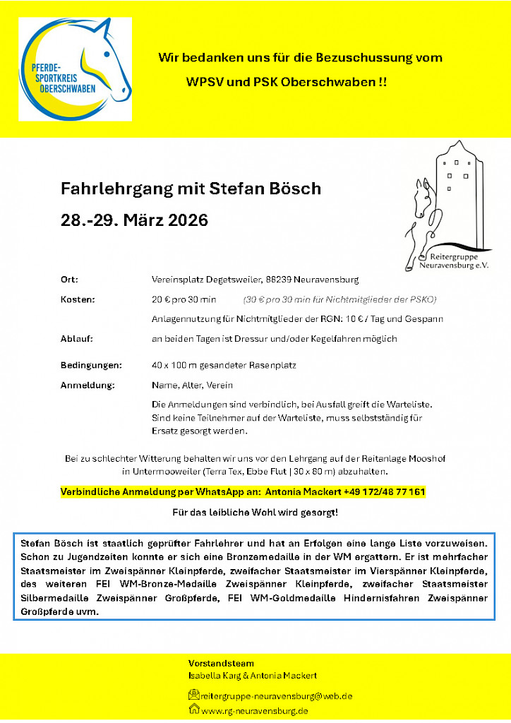 🌟 Fahrlehrgang mit Stefan Bösch bei der Reitergruppe Neuravensburg!🐴🔥 Einladung zum Fahrlehrgang mit Stefan Bösch28. – 29. März 2026Reitergruppe Neuravensburg e.V. Du willst dein Gespann verbessern, souveräner durch den Kegelparcours fahren oder an deiner Dressurarbeit feilen? 📍 Veranstaltungsort / Navi‑Adresse Vereinsplatz Degetsweiler 👉 Bei schlechter Witterung wird der Lehrgang verlegt auf: 📝 Ablauf An beiden Tagen ist Dressurfahren und/oder Kegelfahren möglich – ganz nach Trainingswunsch. 💶 Kosten