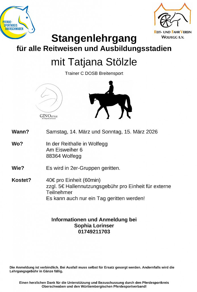 🌟 PSKO-Stangenlehrgang mit Tatjana Stölzle in Wolfegg🌟 Einladung zum Stangenlehrgang für alle Reitweisen und Ausbildungsstadien mit Tatjana Stölzle in WolfeggTrainer C DOSB Breitensport 📍 Wo? 🐴 Wie? 💰 Kosten: 📞 Infos & Anmeldung: