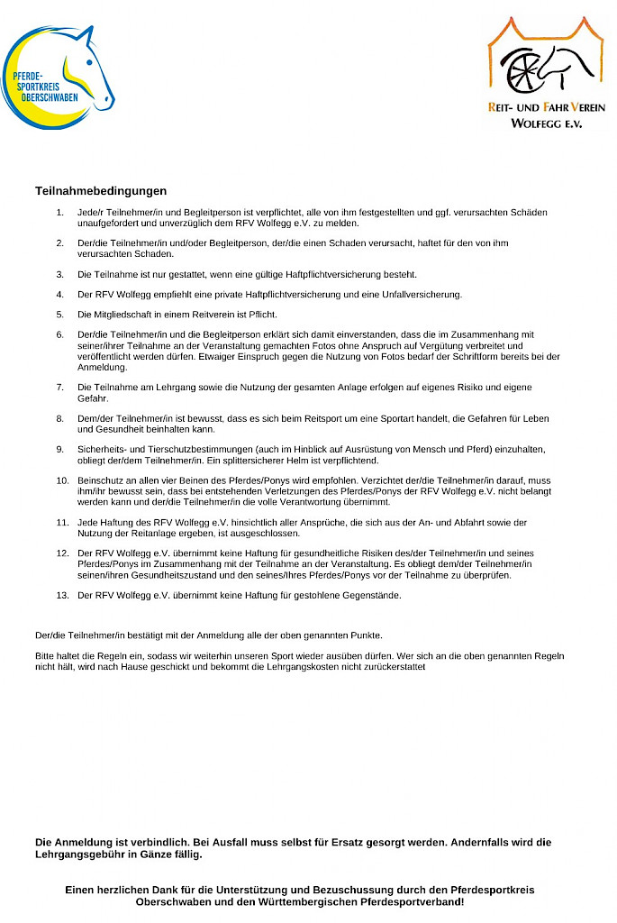 Kurz: Fachlich top – menschlich motivierend – pferdegerecht in jeder Trainingseinheit. ⚠️ Wichtige Hinweise & Teilnahmebedingungen Für den Lehrgang gelten folgende Regelungen: