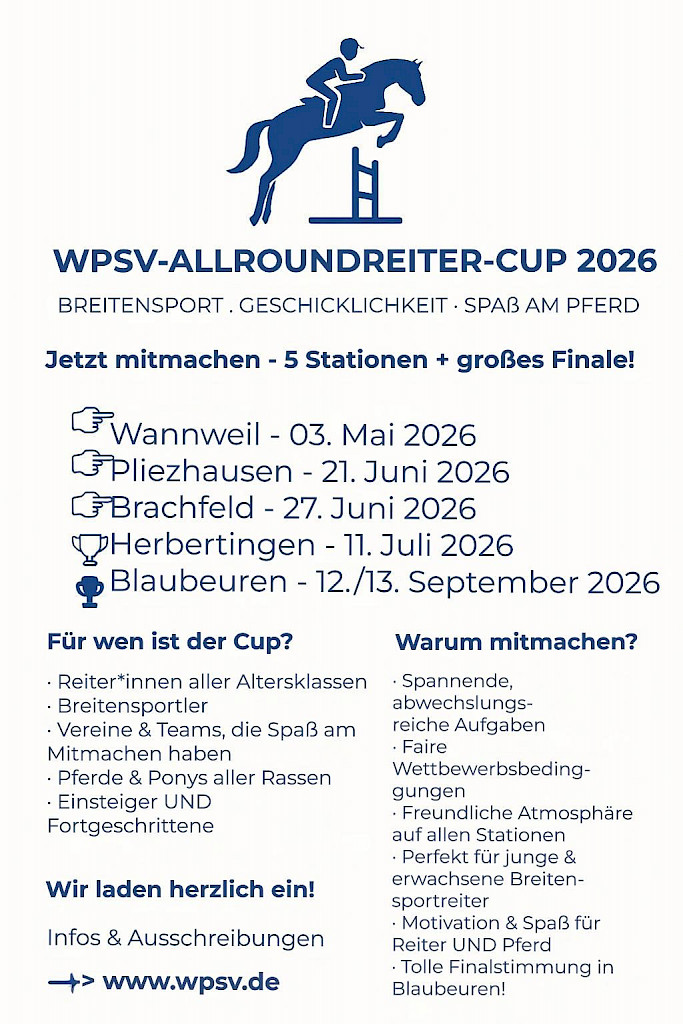 🐴 WPSV‑ALLROUNDREITER‑CUP 2026 Breitensport • Geschicklichkeit • Spaß am Pferd 🏆 FINALE – 12./13.09.2026 – Blaubeuren🐴 WPSV-Allroundreiter‑Cup 2026Veranstaltungsreihe für Breitensport, Parcoursreiten & Geschicklichkeit • WürttembergDer WPSV-Allroundreiter‑Cup umfasst jedes Jahr mehrere Stationen im gesamten Verbandsgebiet Württemberg. Die Serie richtet sich an Einsteiger & Fortgeschrittene, bietet Spaß, Geschicklichkeit, Präzisionsreiten und vielseitige Parcoursformen – mit großer Finalveranstaltung im Rahmen des Württembergischen Pferdefestivals Blaubeuren (wie in 2025). 📍 1. Station – 03. Mai 2026 – Wannweil (PSK Reutlingen/Tübingen)