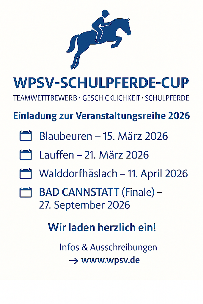 🐴🏆 WPSV‑SCHULPFERDE‑CUP 2026 Breitensport • Geschicklichkeit • Spaß am Pferd 4️⃣ Finale – 27. September 2026 – Stuttgart Bad Cannstatt (LWH)🐴 WPSV‑SCHULPFERDE‑CUP 2026Einladung zur Veranstaltungsreihe 2026Der Württembergische Pferdesportverband lädt alle Vereine, Betriebe, Reitschulen und Schulpferdefans herzlich ein zur WPSV‑Schulpferde‑Cup Serie 2026! Dieser Cup ist ein noch junges, aber wichtiges Projekt zur Förderung des Schulpferdesports in Württemberg – ein Wettbewerb ausschließlich für Schulpferde. 📅 DIE STATIONEN 2026 1️⃣ 15. März 2026 – Blaubeuren