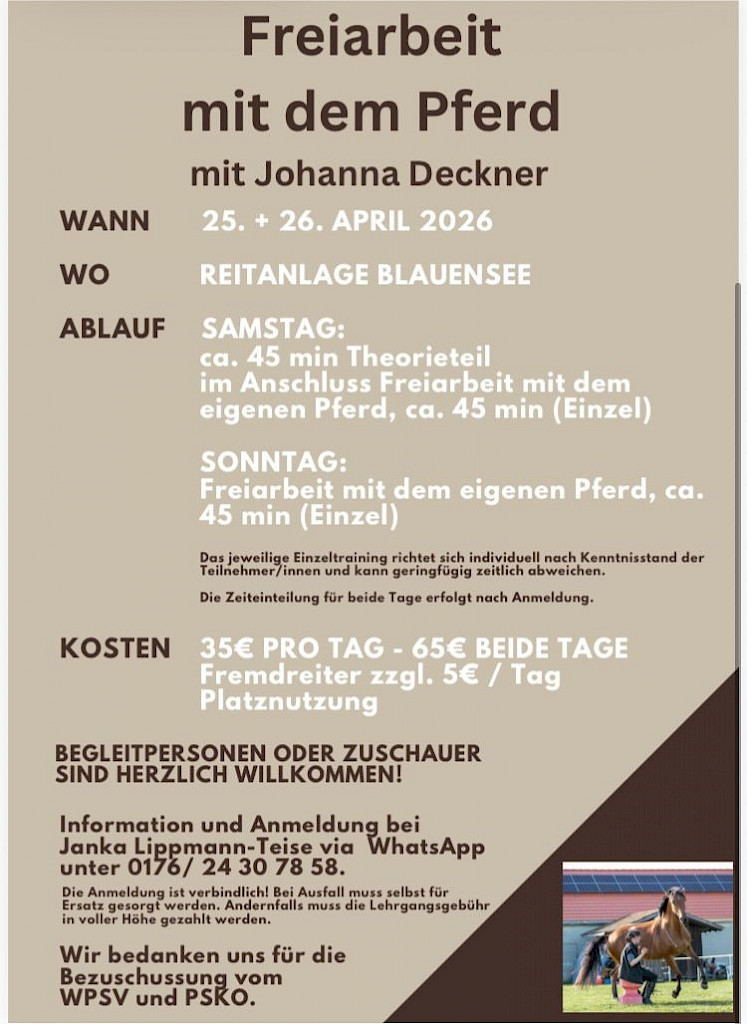 👩🏫 ReferentinSilke Förster 💶 Kosten35 € pro Teilnehmer, inkl. ⏳ Meldeschluss01. März 2026 🧾 Für die Lizenzverlängerung7 LE (Profil 3) für die Verlängerung der DOSB‑Lizenz Voltigieren 📬 AnmeldungMonika Schmidt ⭐ Wir freuen uns auf einen lehrreichen, motivierenden und inspirierenden Fortbildungstag mit euch!
