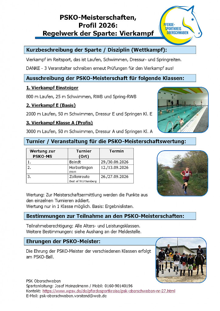 📣 🐴 PSKO-Meisterschaften Vierkampf (Cup) 2026 in Herbertingen (Station 2)! 🏆🏆🔥 Einladung zu den PSKO‑Meisterschaften 2026 – Vierkampf als Cup! 🔥🏆Laufen • Schwimmen • Dressur • Springen – EIN Wettkampf, vier Herausforderungen!Der Pferdesportkreis Oberschwaben lädt alle sportbegeisterten Reiterinnen, Vierkämpferinnen und Vereine herzlich zu den PSKO‑Meisterschaften 2026 in der Sparte Vierkampf ein – dieses Jahr wieder als Cup‑Wertung über drei Turniere! 🐎 Was ist Vierkampf?Vierkampf verbindet klassische Leichtathletik mit Reitsport – ein spannender Mix aus Ein Format, das Teamgeist, Fitness und reiterliches Können perfekt vereint! 🥇 Ausgeschrieben werden die PSKO‑Meistertitel in drei Klassen:⭐ 1. Vierkampf Einsteiger
