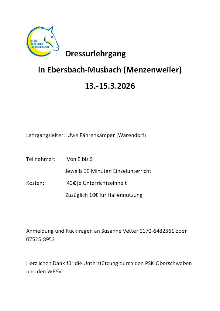 🌟 Dressurlehrgang mit Uwe Fährenkämper (Warendorf) in Ebersbach‑Musbach (Menzenweiler)🌟 Einladung zum Dressurlehrgang 2026! 🌟🐴 In Ebersbach‑Musbach (Menzenweiler) Bereit, deine Dressurskills aufs nächste Level zu heben? 🎯 Was erwartet dich? ✔ Einzelunterricht à 30 Minuten – volle Aufmerksamkeit für dich und dein Pferd 💶 Kosten
