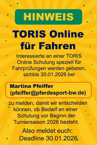 Interessierte an einer TORIS Online Schulung speziell für Fahrprüfungen werden gebeten, sich bis 30.01.2026 bei 📧 Martina Pfeiffer () zu melden, damit wir den Bedarf vor Beginn der Turniersaison 2026 prüfen können.