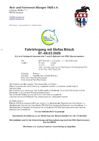 Du liebst den Fahrsport oder möchtest ihn kennenlernen? Dann sei dabei, wenn der Reit- und Fahrverein Wangen einen ganz besonderen Lehrgang auf die Beine stellt – mit niemand Geringerem als Stefan Bösch, mehrfacher Staatsmeister und internationaler Medaillengewinner! 🚀🟡