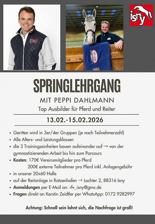 Wir freuen uns riesig, dass wir Peppi Dahlmann, einen der absoluten Top-Ausbilder für Pferd und Reiter, für einen Springlehrgang bei uns in Isny gewinnen konnten! Vom 13. bis 15. Februar 2026 habt ihr die Chance, von seiner Erfahrung und Expertise zu profitieren.