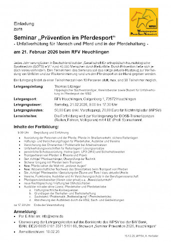 WPSV-Seminar: „Prävention im Pferdesport“ am 21. Februar 2026 mit Thomas Litzinger 📢 mit 4 LE (Profil 5)