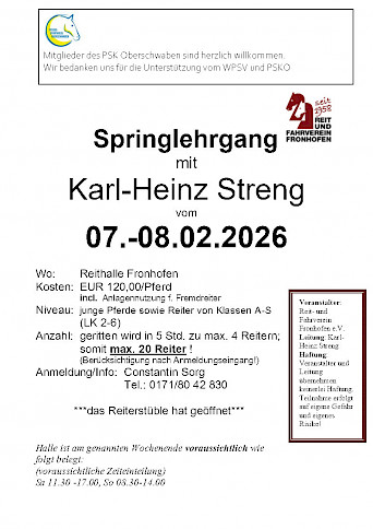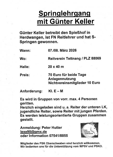 Am 07. und 08. März 2026 lädt der Reitverein Tettnang zum Springlehrgang mit Günter Keller ein!